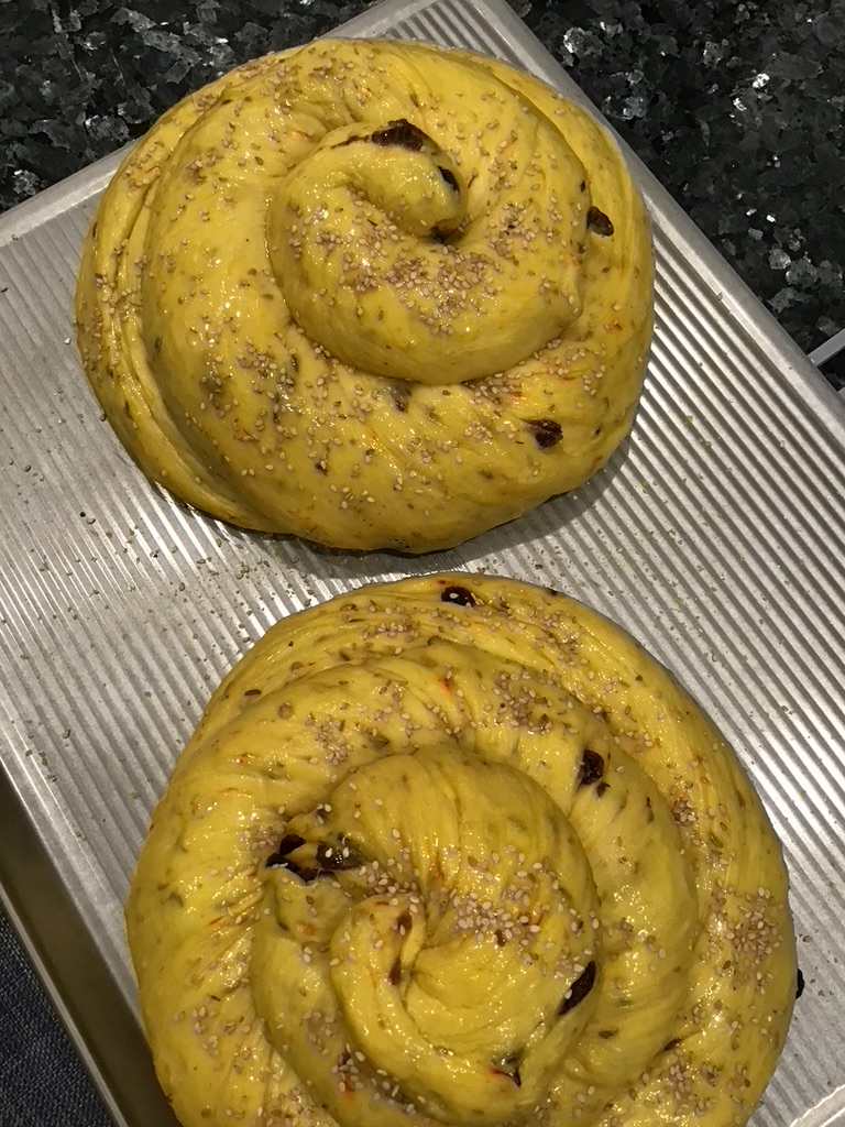 10. Transfer each coil to a baking sheet and cover loosely with plastic wrap. Let stand for 1½ hours, until the loaves have nearly doubled in bulk.